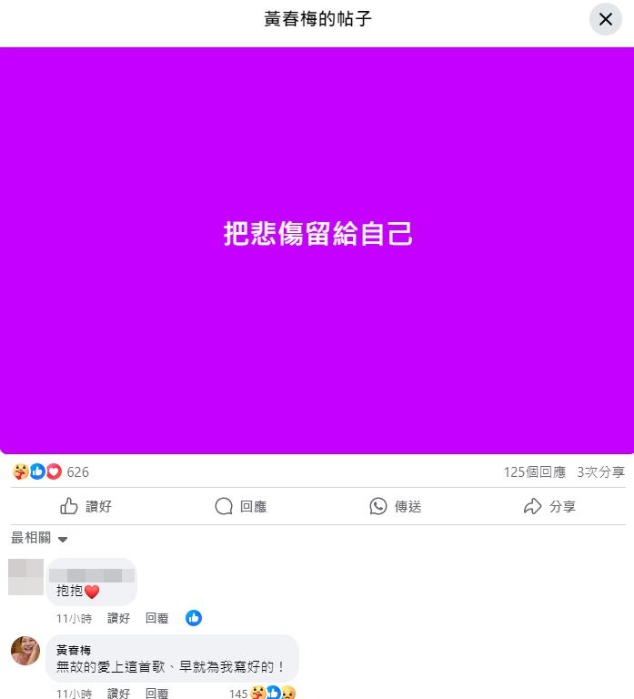 ▲S妈(黄春梅)昨日(10日)深夜11时许突然在社交网发文“把悲伤留给自己”,在留言区写下“无故的爱上这首歌、早就为我写好的!”