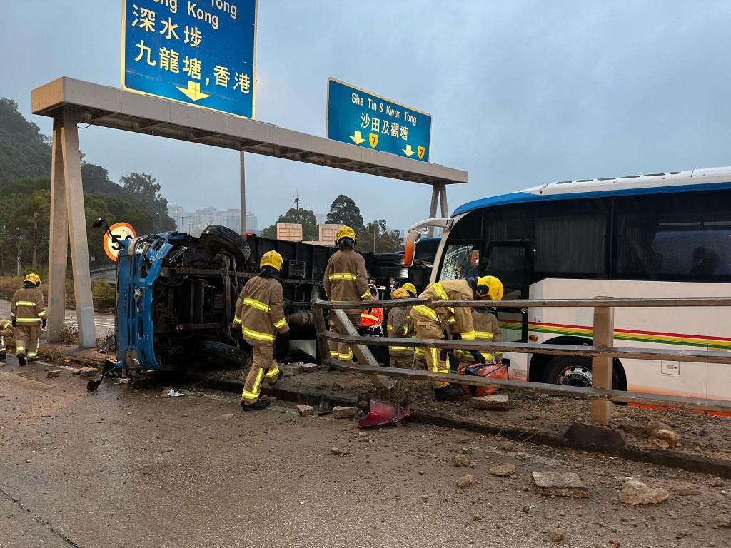 长沙湾发生车祸。 今日(12日)早上6时许,一辆5吨半密斗货车从大埔道落斜,驶至龙翔道近苏屋邨对开位置,怀疑转右弯期间失控,先撞上石壆,继而向右翻侧,整架车横亘石亘之上,隔离行车线一辆正在行驶中的电单车疑收掣不及倒地,铁骑士顿时车仰人翻,一度处于半昏迷状态,而一辆紧跟其后的旅游巴紧急煞车停在后面,现场一片混乱。