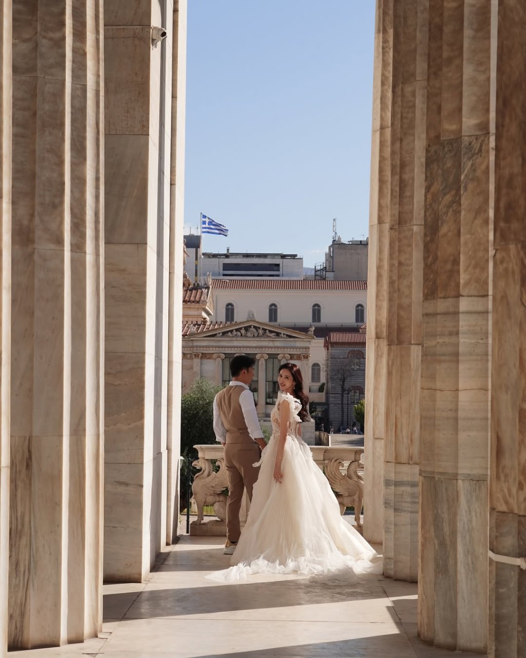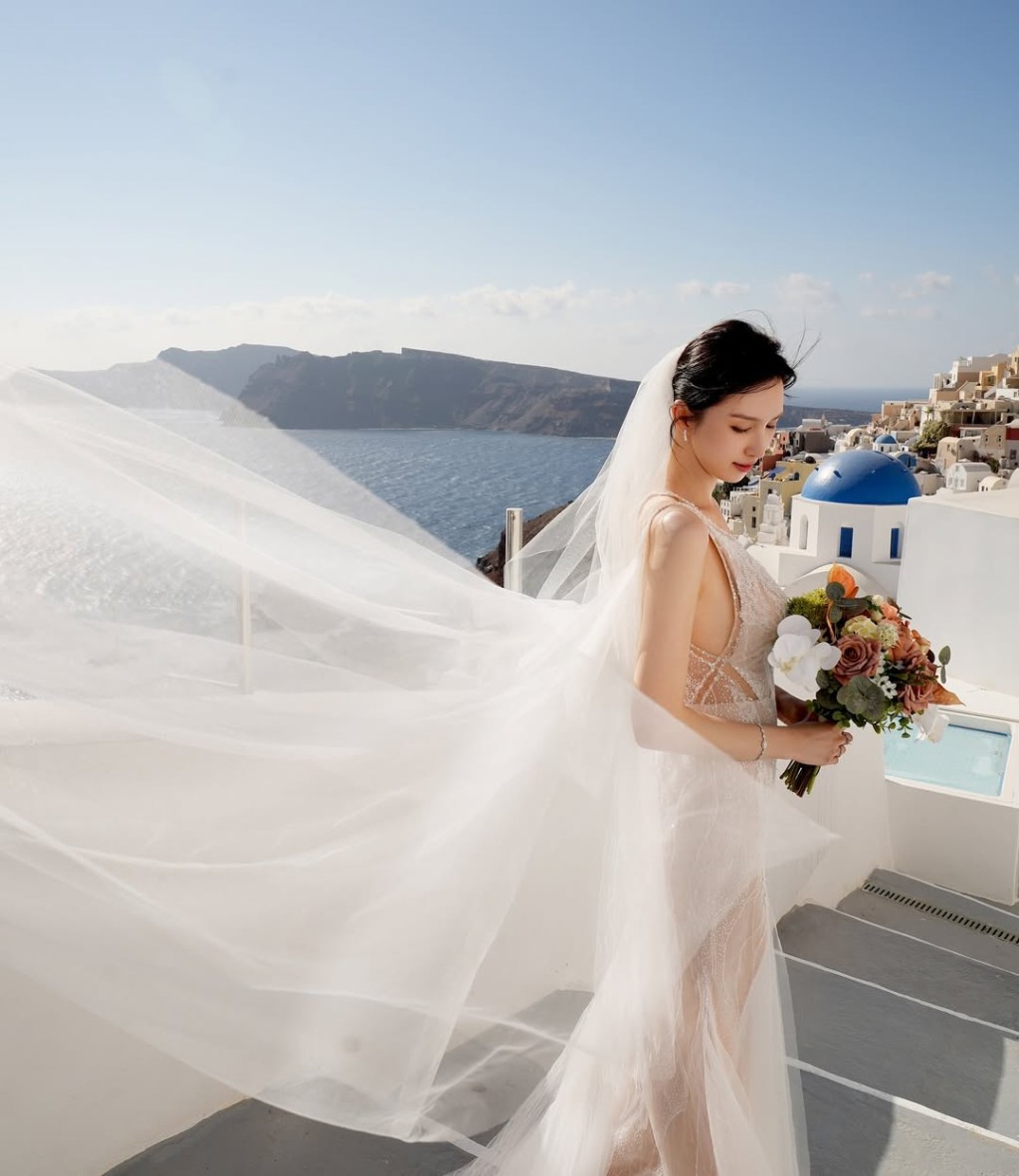 照片可见,何傲儿与未婚夫在希腊的圣托里尼岛的爱琴海拍摄婚纱照,身穿喱士婚纱的何傲儿,美好身材若隐若现,她望着未婚夫的笑容流露着幸福,虽然婚纱照未见其未婚夫的正面,但从他的背面及九一面的大侧面来看,年纪似乎与何傲儿相约。