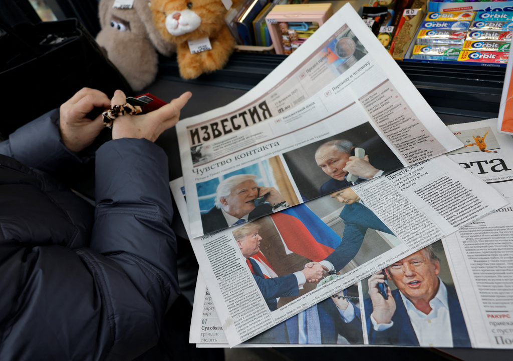 ▲俄罗斯首都莫斯科街头报摊13日摆满多家纸媒,头版均为特朗普与普京通话的报导。(路透)