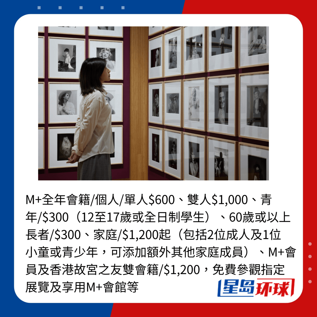 当代视觉文化博物馆M+及香港故宫文化博物馆,均设有不同类型的全年会籍,前者每个会 籍每年可获赠3张免费特别展览礼券,亦可优先购买展览门票,以及7折不设上限选购正价门票或套票。后者的“香港故宫之友”会 籍则享全年不限次数参观专题展览、可获适用于特别展览的进场码,参加会员专属参观时段等。若你是以上两大博物馆的捧场客,不妨申请M+会员及香港故宫之友双会籍,所需费用为$1,200,虽等同两个博物馆的单人会籍费总和,但可享额外1个月会籍有效期。