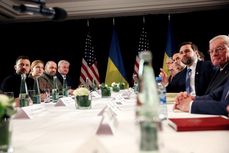 泽连斯基与美国副总统万斯(JD Vance)率领的代表团14日在慕尼黑安全会议(Munich Security Conference)期间举行会谈,会谈结束后双方并未宣布达成协议。3名知情人士透露,当天稍早,泽连斯基与美国跨党派参议员代表团举行闭门会议,泽连斯基在会议中表达了对美方协议草案的担忧,匿名人士表示,泽连斯基“觉得自己被不合理地要求签署尚未读过的合约”,该名人士说:“我不认为他喜欢被胁迫‘要不要随便你’”。