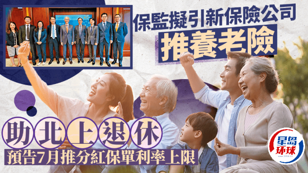保监局表示,正研究引入全新的保险公司,提供保险产品与养老服务高度整合的崭新服务,助港人北上养老,期望今年内可成事。此外,该局预告将于7月1日推分红保单演示利率上限,港币单和非港币单的上限分别为6%和6.5%,以防业界夸大保单回报;又冀首季有针对富人的指数型万用寿险产品在港面世,意味香港将与新加坡争生意。