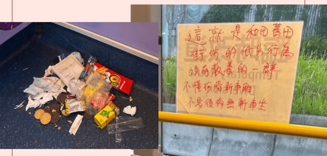 相片看到轮椅停放区中间,放有一堆垃圾,估计为从该辆城巴车厢内清理出的垃圾,车窗上一张“临时改道”的告示,被人用红色笔在后面写上数十字批判的大字报。该大字报写著:“这就是和田菁田街坊的低劣行为,没有教养的一群,不懂珍惜新车厢,不要后悔无新车坐。”