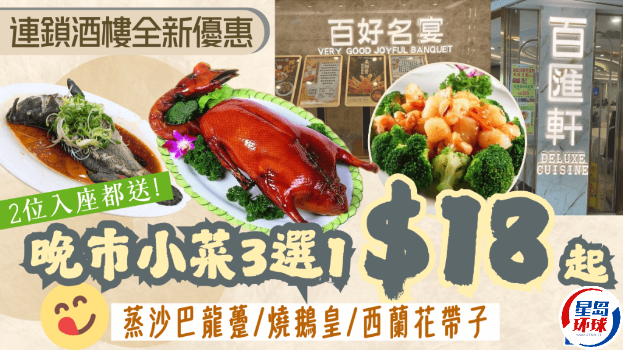 香港的中式酒楼不时都会推出点心或小菜优惠吸客,日前有网民在社交平台群组中发文,表示刚帮衬了马鞍山颂安邨百汇轩酒家,觉得非常抵食,便推介予其他网友。原来百汇轩所属的百好饮食集团近日推出晚市“晚饭优品”超值优惠,特价小菜3选1,可选沙巴龙趸、烧鹅、西兰花虾球带子,每款低至$18,即睇内文优惠详情!