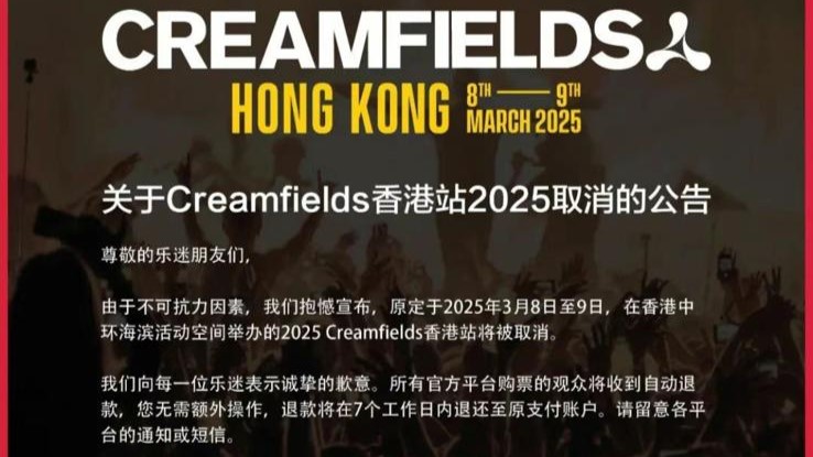 首页>香港>香港社会 Creamfields英国大型电子音乐节香港站取消,主办方: 购票观众获自动退款 发布时间:2025-02-18 08:18 英国大型电子音乐节 Creamfields 原订于3月8日及9日,在中环海滨活动空间举办 2025 Creamfields 香港站。惟其主办方CreamOfficial 今午于微博账户公布,由于“不可抗力因素”,取消活动,并向乐迷致歉。主办方称会为所有透过官方平台购票的观众安排自动退款,退款将于七个工作日内退还至原支付账户。以上内容归星岛新闻集团所有,未经许可不得擅自转载引用。 专题 更多 > 中芯国际上半年营收预计超22亿美元,四季度将试产7nm工艺 太兴盈喜料多赚逾3倍,指将坚守审慎理财政策 中国移动半年多赚5%,中期息增近6% 清华女学霸创业、一年一融资,镁佳股份估值9.3亿美元冲刺港交所 应收账款走高,丰沃股份三成收入打“白条” 惠科股份IPO:获政府补助超53亿,向实控人堂弟采购超8亿 关税战|白宫:特朗普签行政命令,对华关税暂缓期再延长90日 高盛:64%关税成本由美企“买单”,消费者仅承担22% 美媒:特朗普政府通过关税施压,要求买美国军火 热门文章 曹兴诚遭爆料在大陆有“嫩小三”,露骨照曝光,本尊回应 民企座谈会|出席商界巨头大盘点,不止AI科技巨头还有…… 民企座谈会|马云亮相惹关注,蚂蚁上市“触礁”之后首次 民企座谈会|拆局:参会科技企业居多,拆射中美竞争新趋势 港府:没收许智峯危害国安得益,潜逃前转移250万予其母及妻子 缅甸诈骗园区︱公安部长助理赴妙瓦底营救受困者,缅中泰建工作组加快遣返非法入境者 黄珊珊向柯文哲抱怨“国昌收不回来”,对话遭曝光 成大副校长被曝“撞小三”,妻喊被设计,偷吃新铁证曝 美国务院删除“不支持‘台独’”表述,外交部回应 罢免王鸿薇二阶不妙了?最新街访在地人“一针见血”