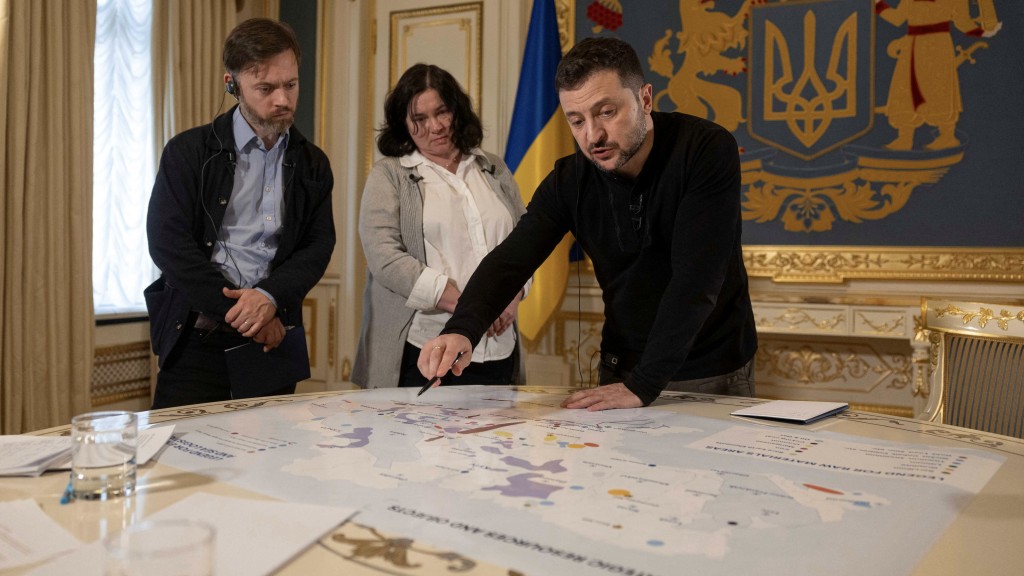 ▲泽连斯基在总统办公室受访,公开乌克兰的稀土矿藏地图。 路透社