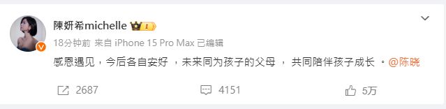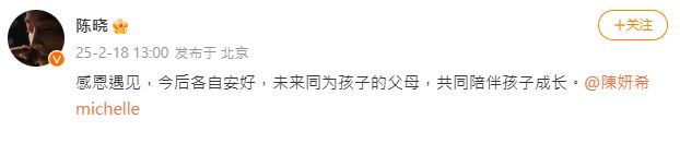 首页>星岛娱乐圈>明星热话 陈妍希宣布离婚!27字告别与陈晓8年婚姻:感恩遇见,今后各自安好 发布时间:2025-02-18 13:47 陈晓陈妍希官宣离婚!台湾女星陈妍希与老公陈晓因合作《神雕侠侣》相恋,2016年结婚后诞下儿子“小星星”,一直是外界眼中的模范夫妻。但去年6月就爆料婚变,已经分居一年多,外界对两人的离婚情况众说纷纭,不过双方始终都没公开回应。▲陈妍希宣布离婚!27字告别与陈晓8年婚姻:感恩遇见,今后各自安好陈晓和陈妍希终宣布离婚今日(18日)陈晓和陈妍希终宣布离婚,两人在微博齐齐发文:“感恩遇见,今后各自安好,未来同为孩子的父母,共同陪伴孩子成长。” 相关阅读 陈妍希陈晓离婚丨两个月前丁父忧女婿缺席,陈晓一举动被嘲无情登热搜 明星热话2025-02-18 陈妍希陈晓离婚|夫妇2年前最后一次合体曝光!生日会全程零互动 明星热话2025-02-18 陈妍希陈晓离婚丨陈妍希工作室发声明针对失实揣测,捍卫独子是彼此最重要的人 明星热话2025-02-18 陈晓低调捐款助西藏灾区,1细节遭疑“真跟陈妍希分道扬镳” 明星热话2025-01-11 专题 更多 > 中芯国际上半年营收预计超22亿美元,四季度将试产7nm工艺 太兴盈喜料多赚逾3倍,指将坚守审慎理财政策 中国移动半年多赚5%,中期息增近6% 清华女学霸创业、一年一融资,镁佳股份估值9.3亿美元冲刺港交所 应收账款走高,丰沃股份三成收入打“白条” 惠科股份IPO:获政府补助超53亿,向实控人堂弟采购超8亿 关税战|白宫:特朗普签行政命令,对华关税暂缓期再延长90日 高盛:64%关税成本由美企“买单”,消费者仅承担22% 美媒:特朗普政府通过关税施压,要求买美国军火 热门文章 民企座谈会|拆局:参会科技企业居多,拆射中美竞争新趋势 港府:没收许智峯危害国安得益,潜逃前转移250万予其母及妻子 台湾政党最新民调变了,蓝绿悬殊,林浊水:哀鸿遍野 黄珊珊向柯文哲抱怨“国昌收不回来”,对话遭曝光 成大副校长被曝“撞小三”,妻喊被设计,偷吃新铁证曝 曹兴诚亲密照是AI合成?谢寒冰提“这张”反击了:真想看原图? 路透:台湾考虑向美国采购70亿至100亿美元军武 罢免王鸿薇二阶不妙了?最新街访在地人“一针见血” 美俄谈判登场俄拒领土让步,泽连斯基:不承认“乌不在场”协议 香港80年代性感女神,尺度破格演出翻Hit,领先章子怡40年!