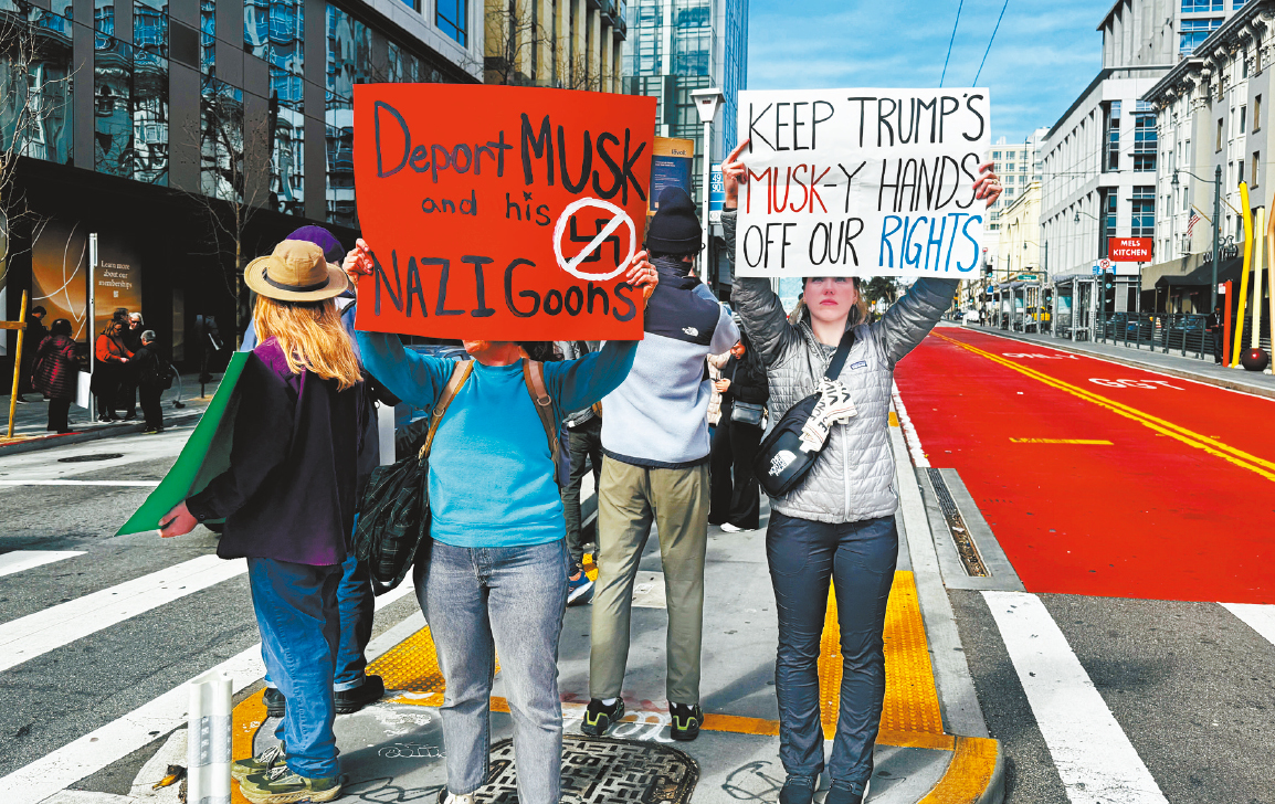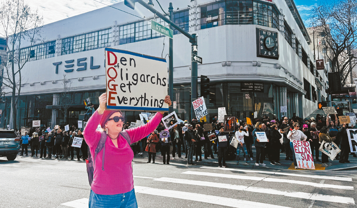 另一批数百名示威者同时段在Van Ness大道上的特斯拉展示中心外,抗议马斯克作为特朗普政府的关键人物,推动削减联邦预算与解雇公务员。