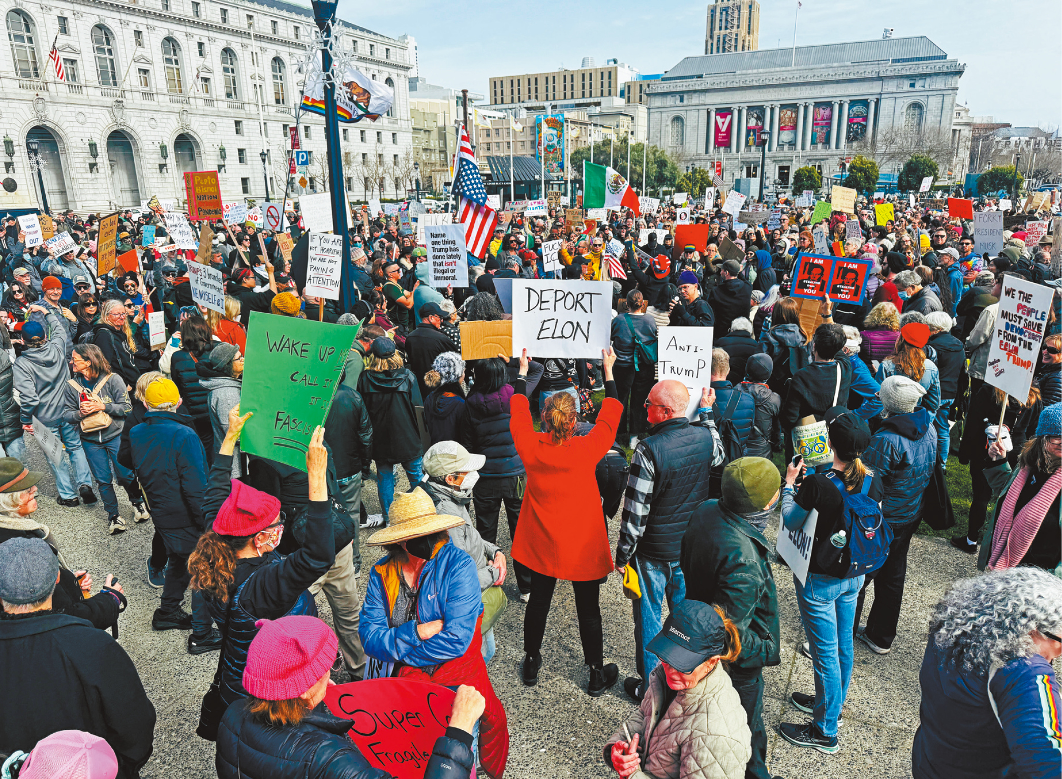 ▲数百名示威者聚集在三藩市市政厅前,抗议特朗普政府的政策与马斯克的影响力。记者苏婕雅摄
