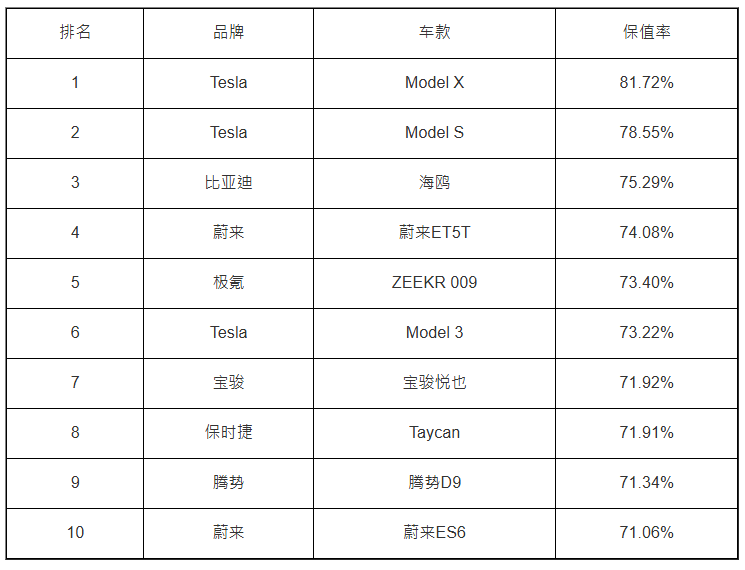 2024年新能源车1年保值率公布:Tesla雄据首两席 比亚迪排第三