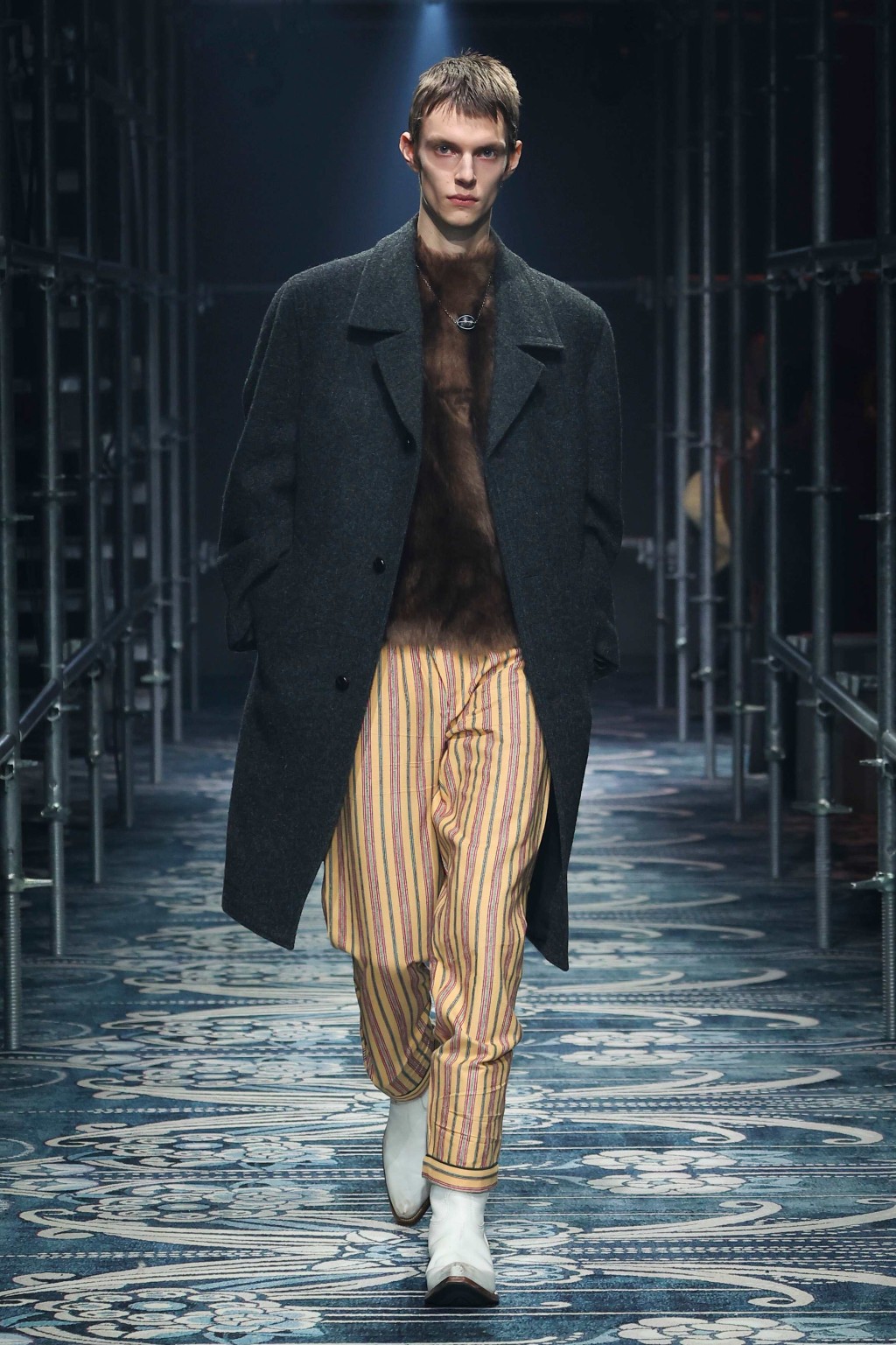 由Miuccia Prada及Raf Simons共同设计的Prada秋冬男装系列以Unbroken Instincts为主题,以时装作为工具来表达人类本能。服装的本能就是裹身,因此品牌就从无拘束的基础上碰撞出反差视效,设计师随心并凭直觉将新旧融合,同时加入玩味的街头混搭风,带来非一般的新面貌。羊毛是一种感官上的保护层,可内外穿着,而部分贴身针织服的领位则饰以金属吊饰,用意只为新装加添可观性。整个系列中相信最原始又直接的演绎,必数其中拼以似曾相识的条子图案、令人联想到家居服,甚或睡衣造型设计的裤子,猫行模特儿上身大胆配衬大衣或毛衫,实验性的造型穿搭碰撞出惊喜火花。品牌秋冬继续擅用拿手的面料拼搭与复古纹理,当中吸睛的花样尖头高筒靴,为看官呈现亦远亦近的共同回忆。