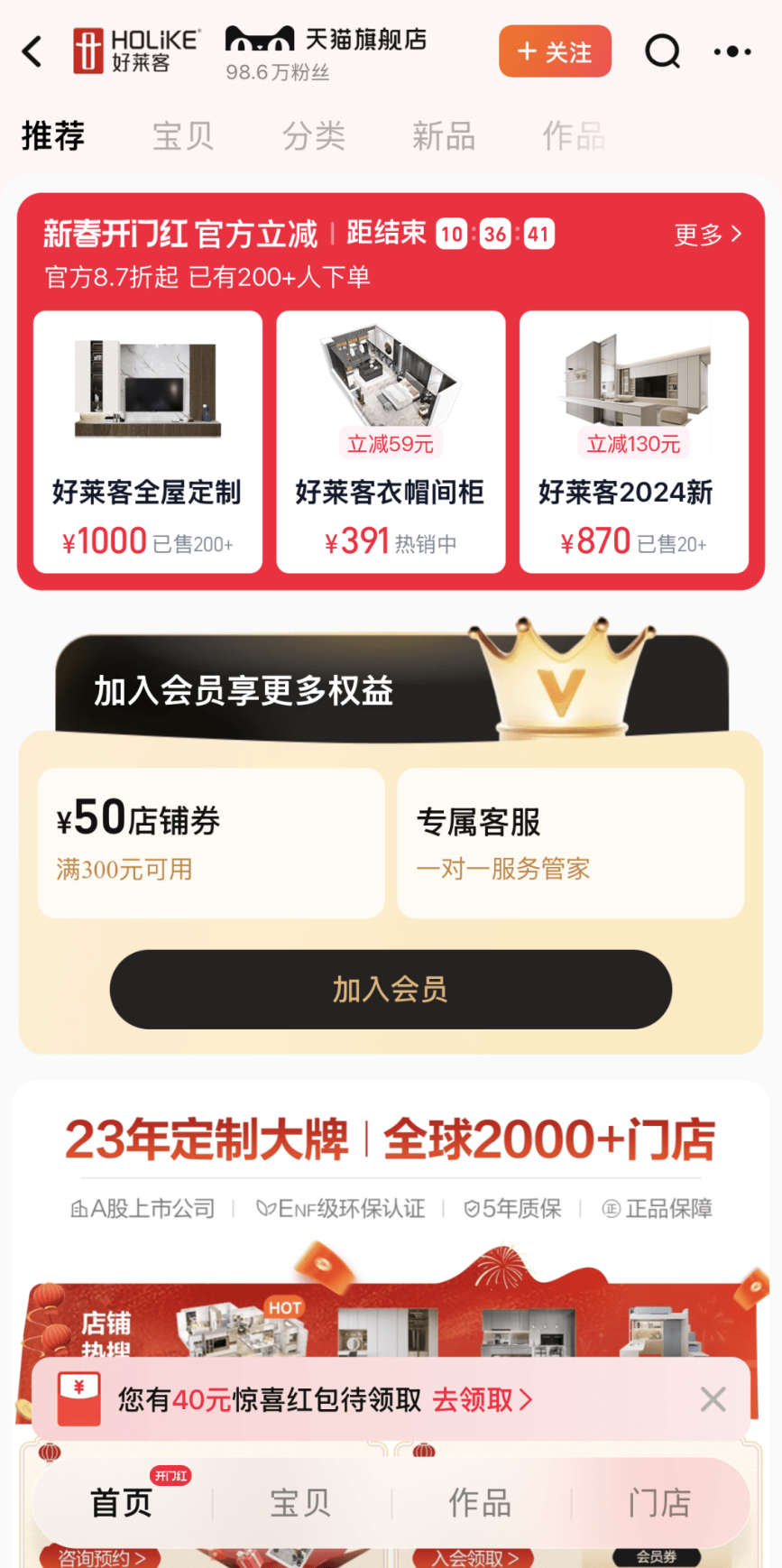 这次进驻淘宝实体店的有逾100个淘宝商户,全部均为信誉超卓的大型企业及商家,包括有中国上市公司及淘宝神店榜排头位的创意家具品牌,例如主要提供厨柜订造服务的“⾦牌家居”、全屋家具订造的“好莱客”、瓷砖专家“东鹏控股”及“蒙娜丽莎”,以及售卖卫浴洁具的“四季沐歌”等,一站式满足港人所需。