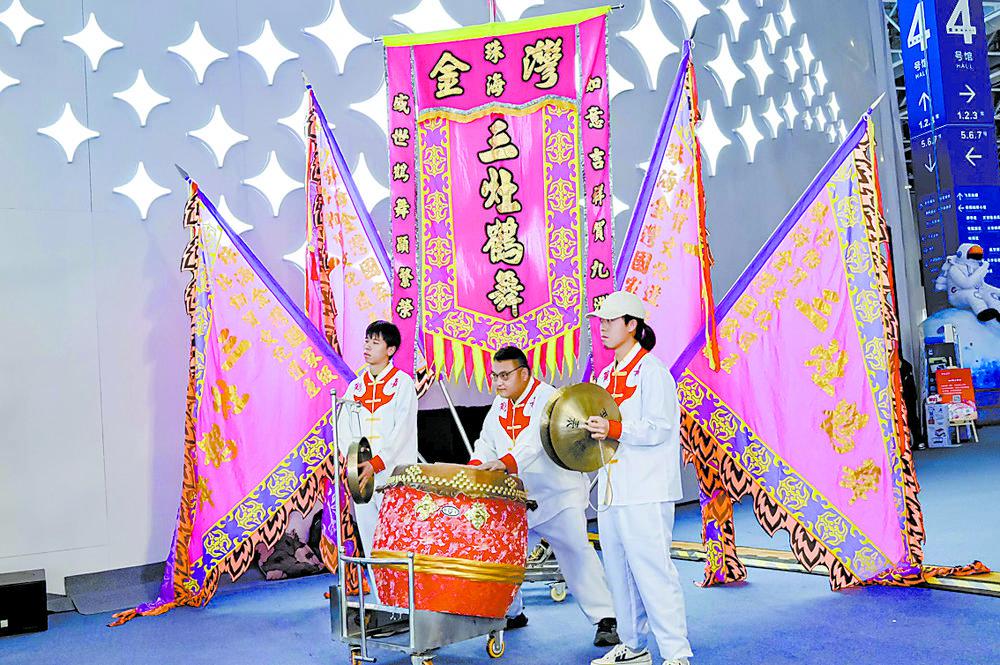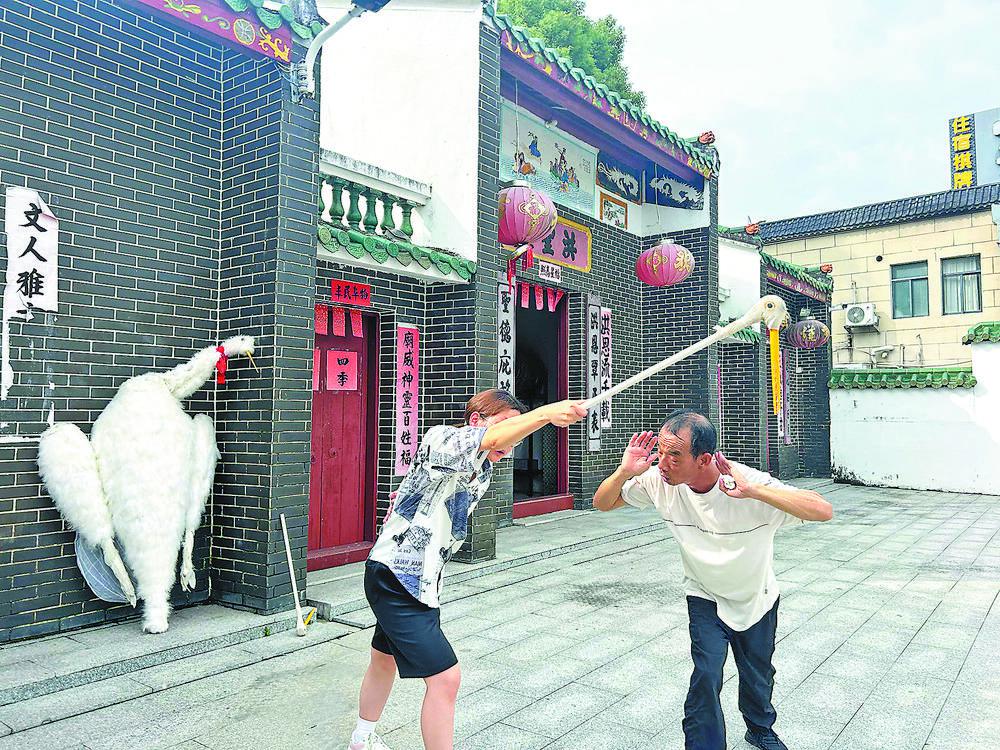如今,鹤舞的表演逐渐走出村子,来到各地的舞台上面向全国的观众进行演出,鹤舞的形式也发生了一些变化。据谈森荣介绍,一场演出通常需要10人:一人唱鹤歌,三人使用鼓、锣、镲,六人跳鹤舞。“咚咚、咚咚咚咚、咚咚咙咚咚、咚咚咙咚咚、镲……”随着鼓声变换,六只鹤分别表演不同的动作,展示鹤的各种习性。舞者的表演活灵活现,伴着铿锵的鼓乐,观众如临其境,仿佛真的见到了鹤群。由过去的一只鹤独舞到如今六只鹤汇集在一方舞台上,这对舞者来说也是一个考验。