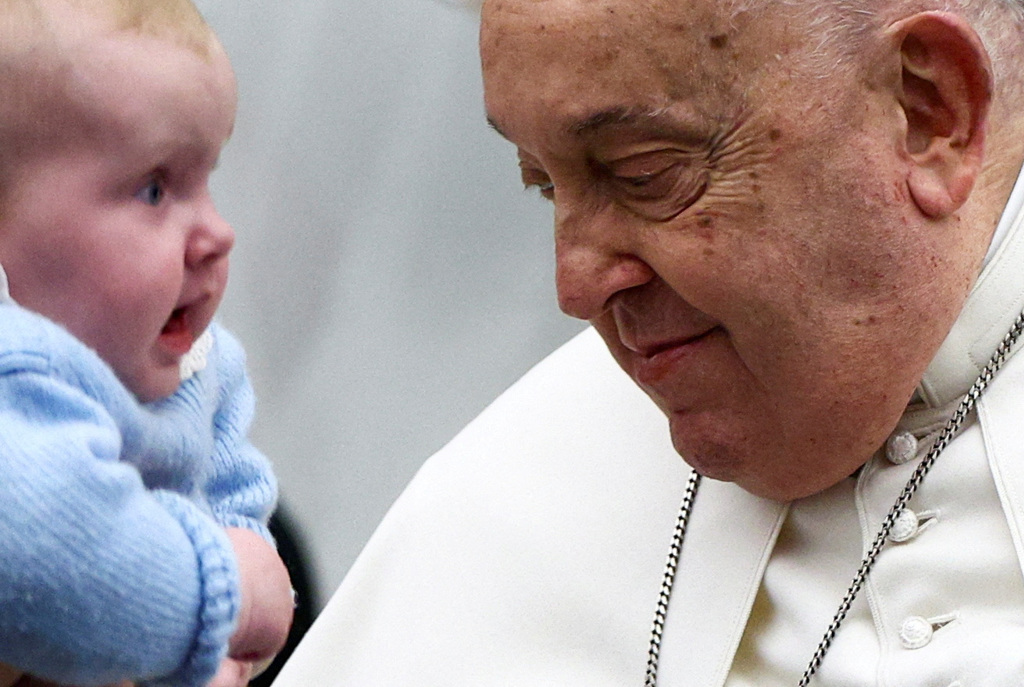 ▲天主教教宗方济各12日在梵蒂冈例行公开接见教徒时与婴儿互动。方济各14日因呼吸困难住院。(资料照/路透)