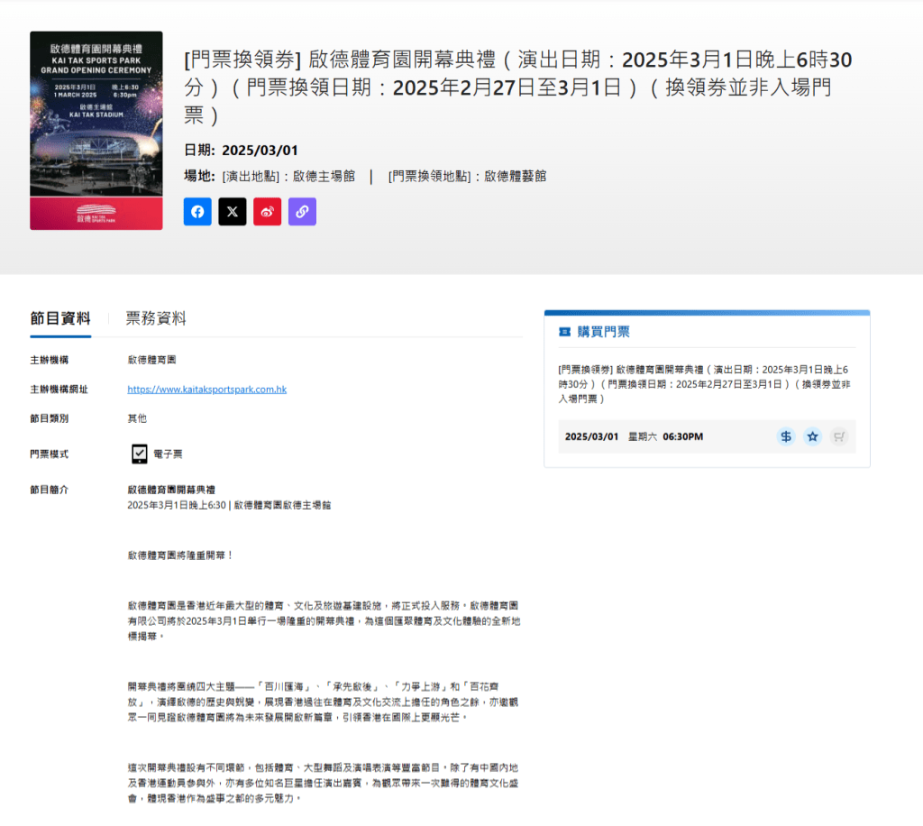 城市售票网发售的是开幕典礼门票的换领券,市民需要携同电子换领券及身份证明文件换取实体入场门票。
