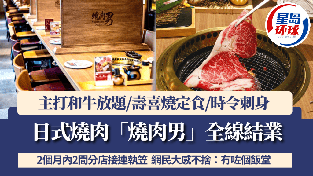 结业潮2025|香港饮食业面临考验,近年结业潮不绝。早年于屯门及将军澳开店、主打和牛放题的日式烧肉店“烧肉男”,于网上宣布因租约期满,2个月内接连结束2间分店,并感谢客人的支持,换言之现已全线结业。结业消息一出,不少过往食客大感不舍,并慨叹“生意难做”。