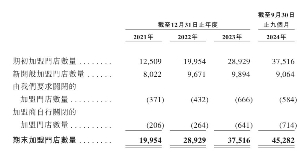期内,逾99%门店为加盟店,亦即有45,282家,其余为自营门店,而加盟商伙伴有19,780个。虽然自营门店不多,但根据其初步招股书提及,去年首9个月公司决定关闭或向加盟商转让若干自营门店。
