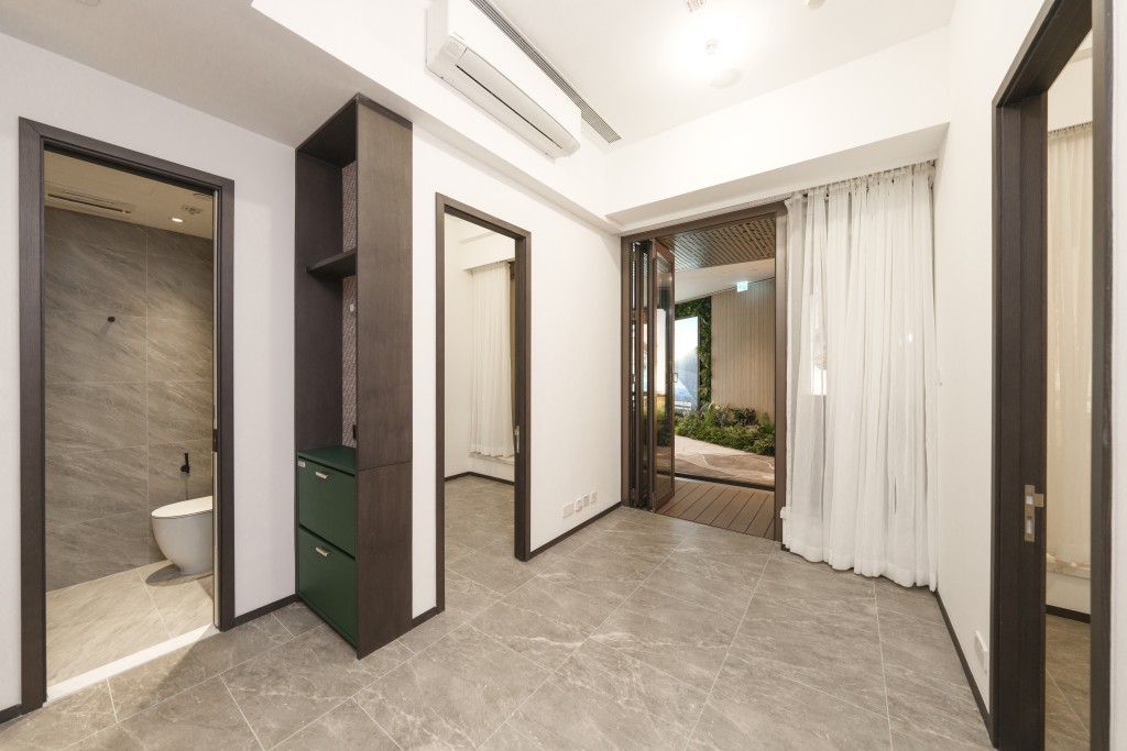 单位层与层之间高度约3.5米,配有储物室空间及天花储物位置,玄关位特设嵌入式鞋柜,开则方正实用,长方形客饭厅长约5米,阔约2.5米,客饭厅连接38方呎的“三合一”露台。