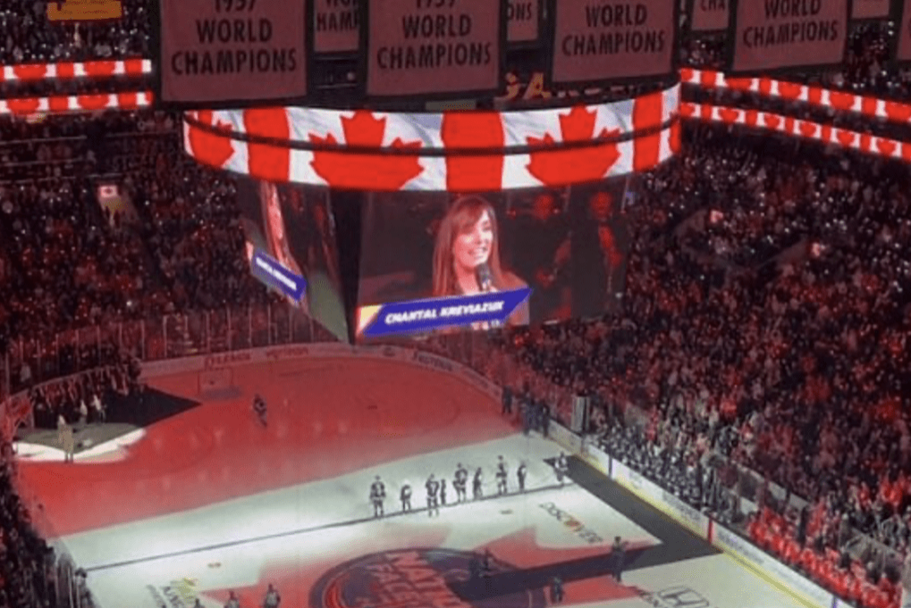 ▲加拿大著名女歌手香岱儿在四国冰球赛现场演唱加国国歌《O Canada》时,刻意修改歌词,藉此向特朗普还击。