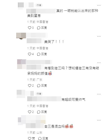 有网民就留言指当日在大型玩具店遇见栢芝,估计她正在买玩具给儿子:“一看她眉毛就认出来是她,超有辨识度。昨(前)天小孩玩玩具车刚好撞到她的鞋,上次在小区会所也看到她过来健身!整个人超美啊! ”楼主也大表认同,直指张栢芝美到令人窒息,但其他网民似乎对其儿子更有兴趣,留言问道:“有看到老三吗?想知道老三有没有继承妈妈的颜值”,楼主即回覆:“有!超可爱帅气”,但当有人问到“老三是混血吗”、“像不像谢霆锋啊”等问题,她就未有回覆。