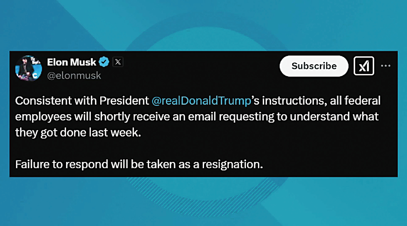 ▲马斯克在社媒上表示,所有联邦员工很快收到一封电邮,要求说明上周完成的工作,而未于东部时间24日晚11时59分前回复者,将被视为自动辞职。 电视截图