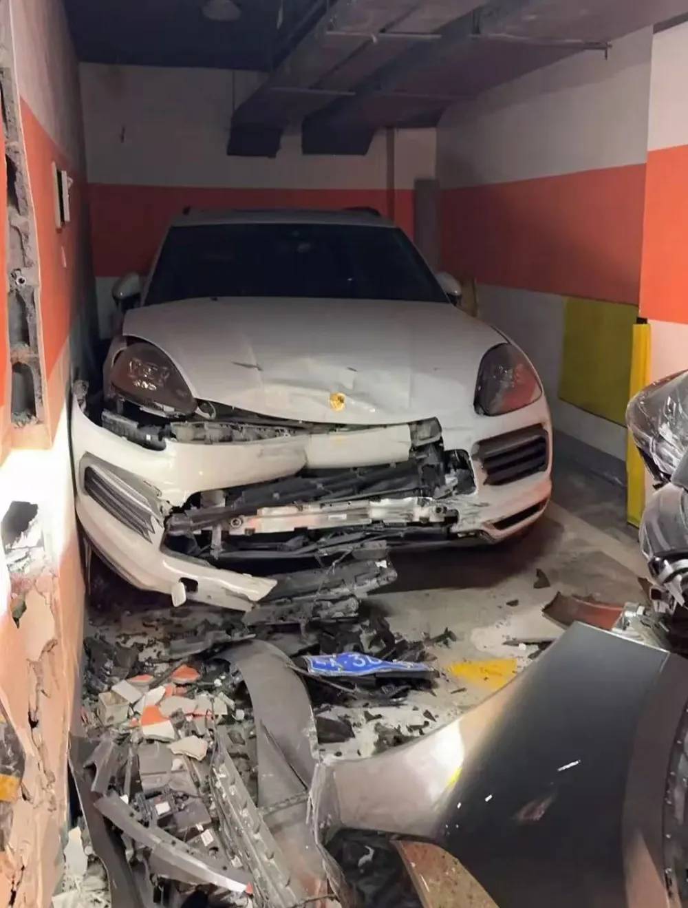 张女士发布照片显示,其保时捷车头损毁严重,零件散满一地,保时捷所停的位置墙身有多处受损。另有一辆理想电动车车头同样严重损毁。