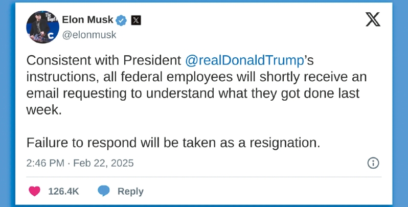 ▲总统特朗普支持政府效率部的马斯克的要求,敦促联邦员工必须在周一结束前汇报他们最近一周的工作,否则将面临被解雇的风险。不过,员工对政府的混淆情况也引发了新的诉讼。 X平台图片