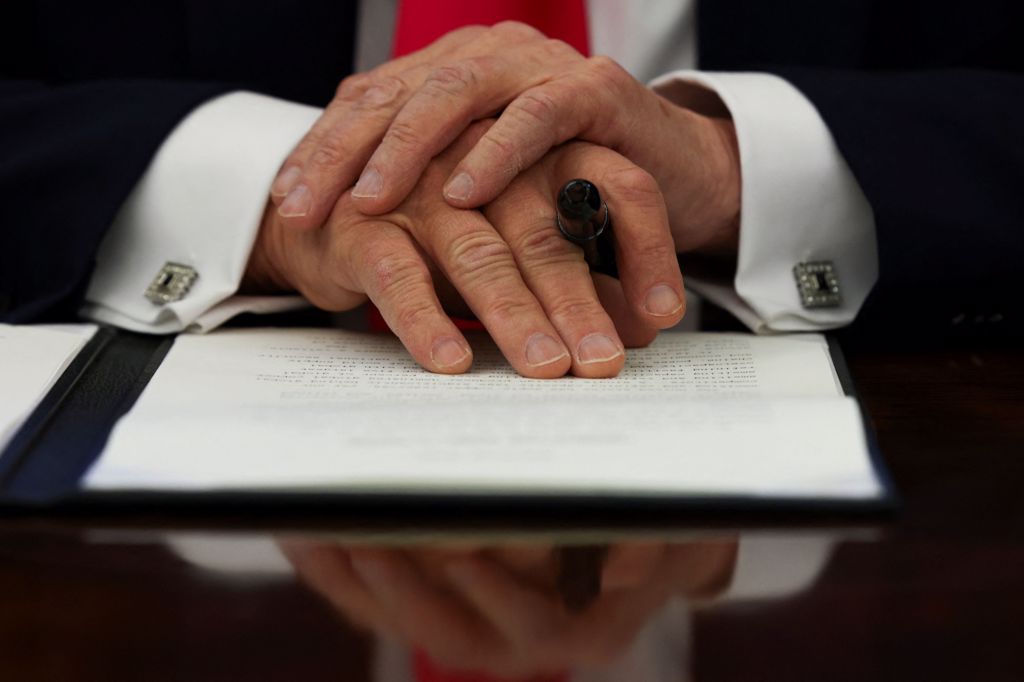 ▲美国总统特朗普于2025年2月25日在白宫椭圆办公室签署行政命令当天,双手合十。(图/路透)