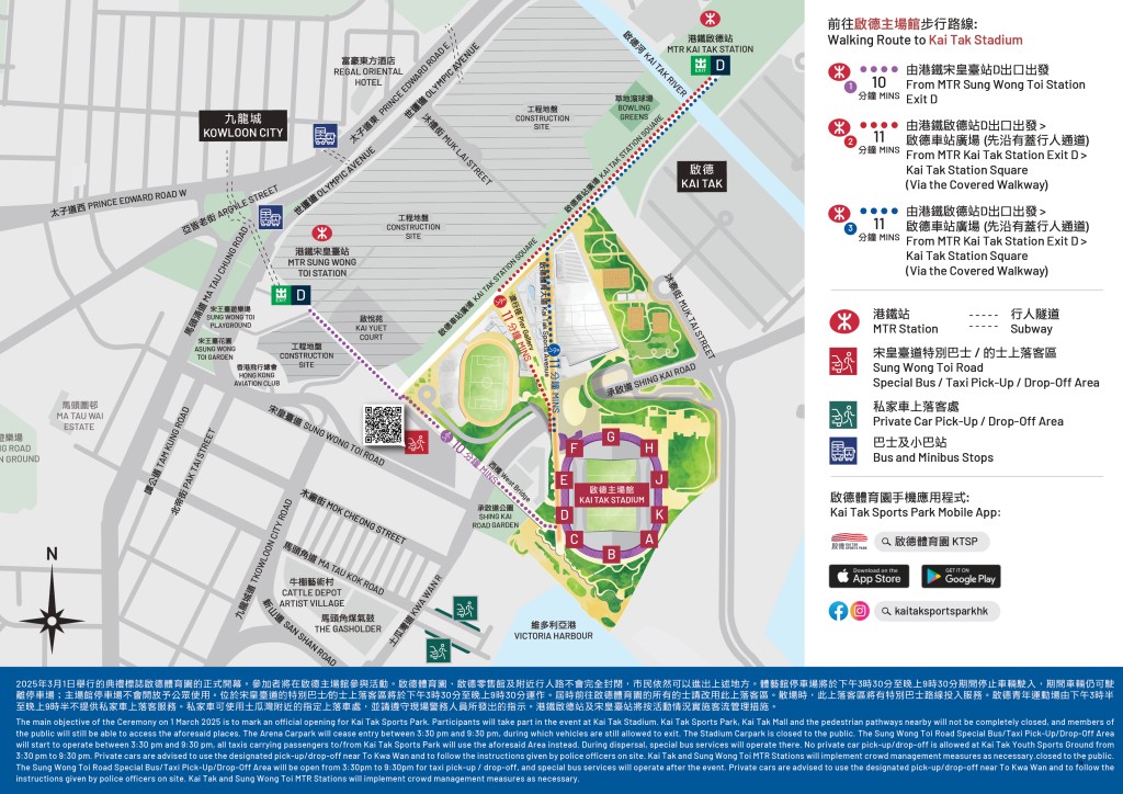 乘搭港铁的市民可在屯马线启德站或宋皇台站下车。如前往启德体艺馆,启德站D出口最为便利。宋皇台站邻近启德主场馆及启德青年运动场,于宋皇台站D出口步行约10分钟。