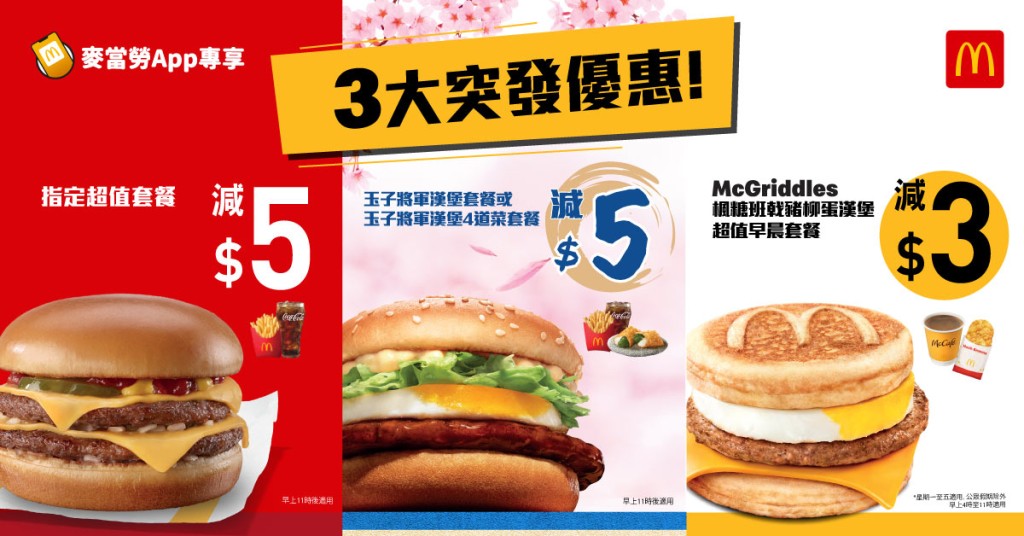 麦当劳优惠|即日起,麦当劳 App 再次带来三款超值突发优惠!各款超值套餐大减 $5、玉子将军汉堡套餐减 $5,McGriddles 早晨套餐亦可减 $3,从早餐到晚餐,全天候享受超抵的美味时光!