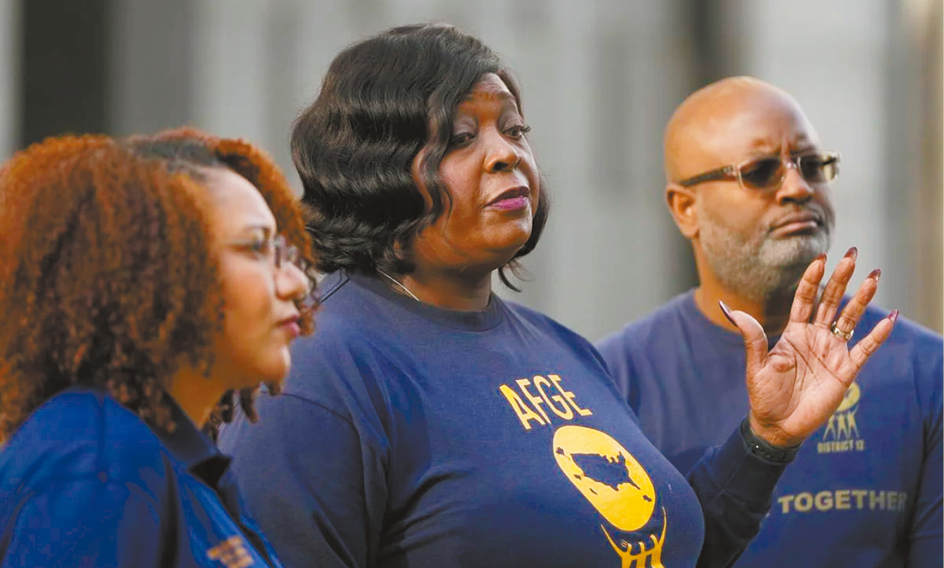 ▲旧金山联邦地方法官裁定白宫人事管理办公室没有合法权力解雇政府部门雇之后,美国政府雇联合会2110分会主席尼科尔斯(中)表示,裁决是工会的重大胜利。 美联社
