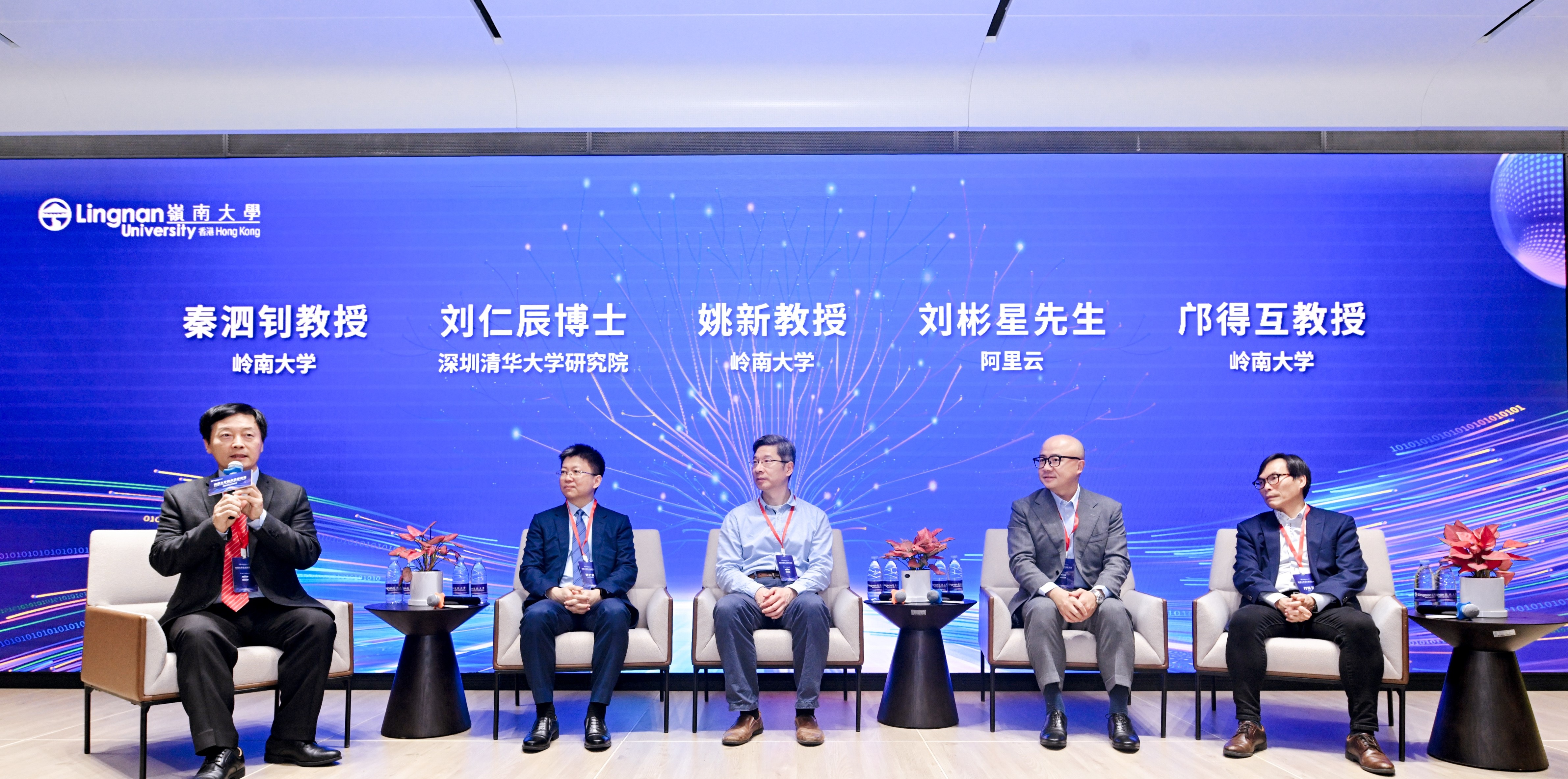校长及韦基球数据科学讲座教授秦泗钊教授在论坛上主持高峰对话,围绕科研成果如何转化为实际应用、如何推动科技创新与可持续发展等议题进行深入讨论。深圳清华大学研究院常务副院长刘仁辰博士;阿里云智慧国际业务副总裁、亚太北及东南亚大区总经理刘彬星先生;与岭大副校长姚新教授、协理副校长(策略型研究)及利荣康计算智能学讲座教授邝得互教授等参与了精彩对话。