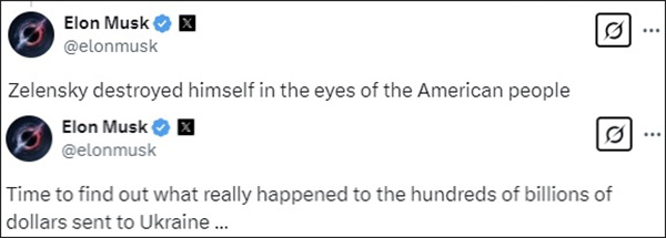 马斯克在评论区留言称,“泽连斯基在美国人民眼中毁了自己”。他还单独发文称,“是时候弄清楚送往乌克兰的数千亿美元到底去了哪里。”