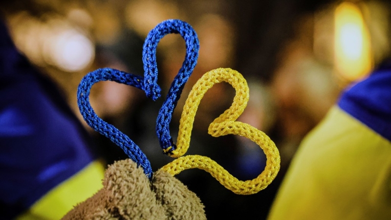 ▲示威者手持乌克兰国旗颜色的心声援乌克兰人。美联社