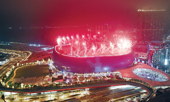 ▲启德体育园主场馆绽放烟火,标志香港新地标正式开幕。