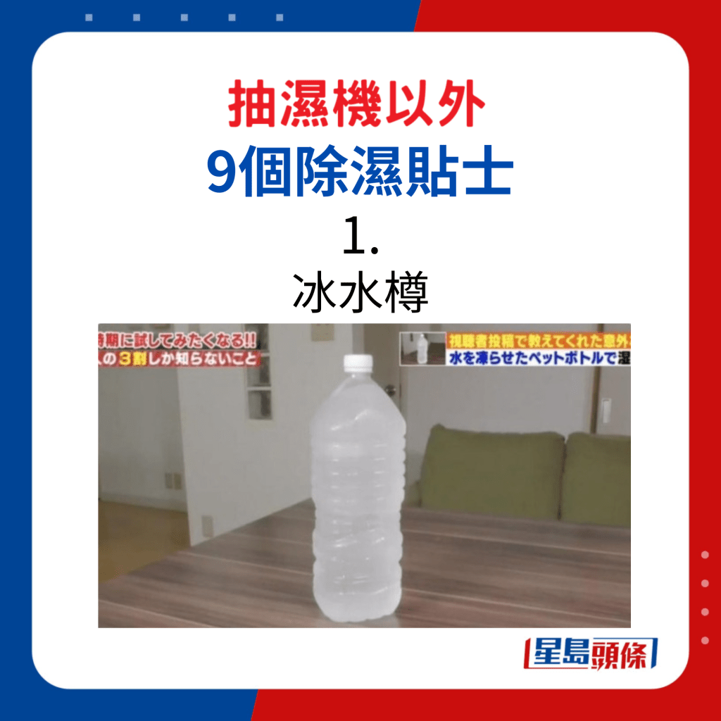 日本朝日电视台综艺节目《くりぃむしちゅーのハナタカ!优越馆》就曾经介绍个一个超强方法去除湿,而且非常简单容易,只需HK$0便可做到!这方法只需预备一支塑料瓶装水,并将水放冰箱冷藏直至完全结冰,然后将“冰水”放在家中需要除湿的位置,例如是衣柜、厨房或浴室等,即可吸湿。