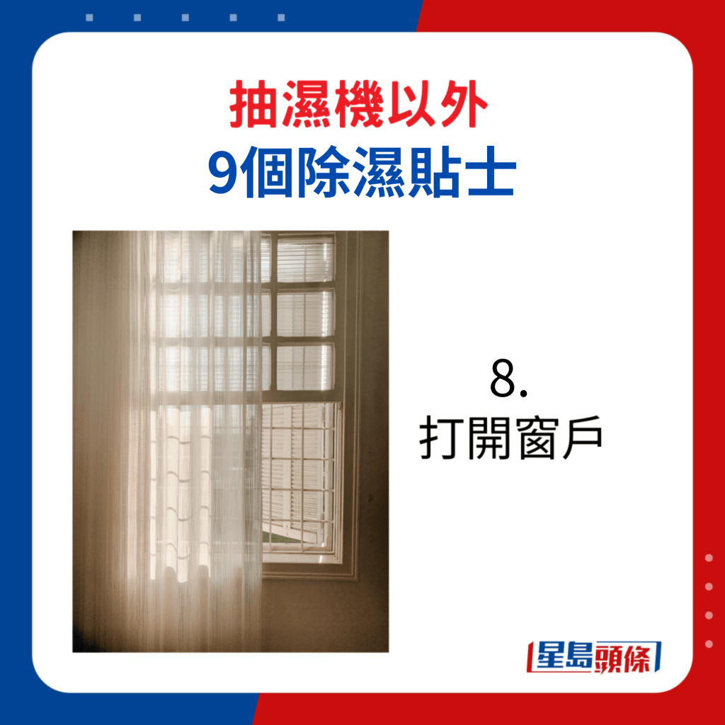打开窗户让室外空气流通,维持除湿效果,惟最好选择有风或室外湿度较低的日子。