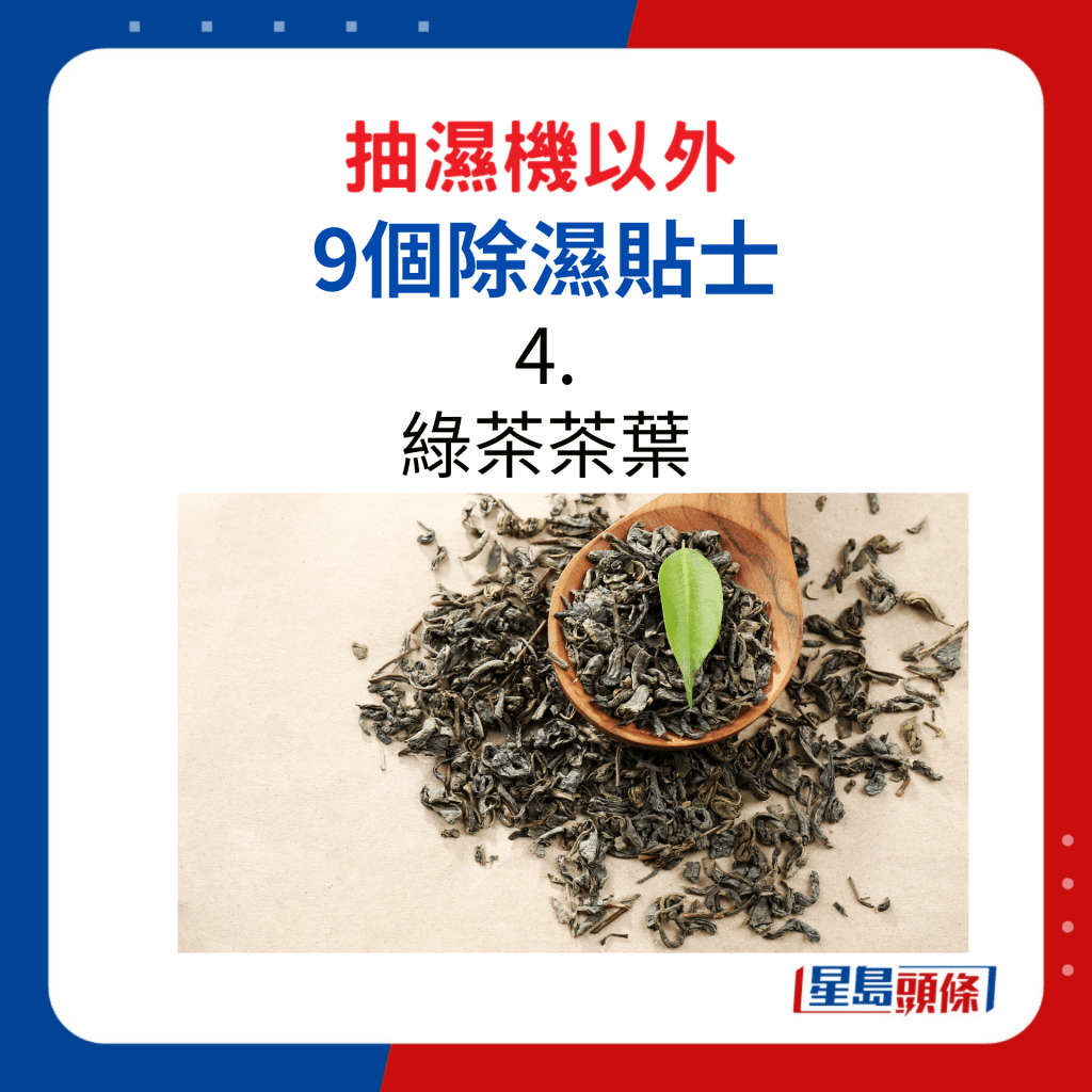 绿茶的茶叶含有鞣质成分,可除湿及除霉,只需将绿茶茶叶或茶包放置衣柜或鞋柜中便可吸湿。