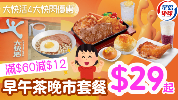 大快活优惠|连锁快餐店大快活近日于推出4大快闪优惠!大快活手机App会员由即日起至3月5日,于早、午、下午茶及晚市购买指定套餐美食,即可享低至$27的优惠价!另外还有多张优惠券包括惠顾任何美食满$60即减$12、购买马来风味套餐系列减$5等;而茶市时段亦推出新一轮加配优惠,即睇大快活超值优惠详情!