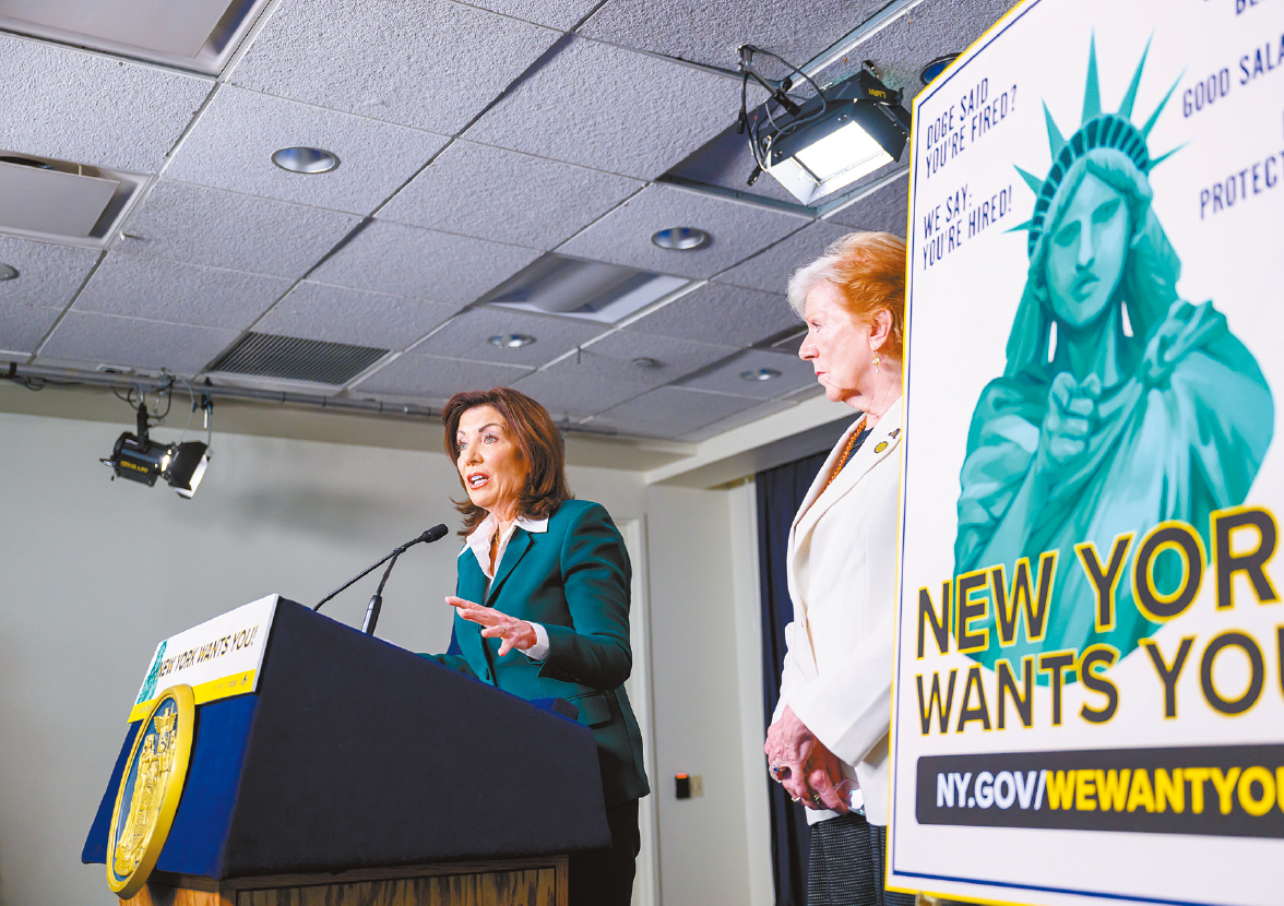 在打着“反普”旗号之际,胡楚新推出“你已获录用”(You're Hired)倡议,鼓励被解雇的联邦工作人员寻找州府职位空缺。州府已在华盛顿特区的联合车站(Union Station)和纽约的莫伊尼汉车站(Moynihan Station)张贴了广告看板,也制作了宣传册来强调就业机会。