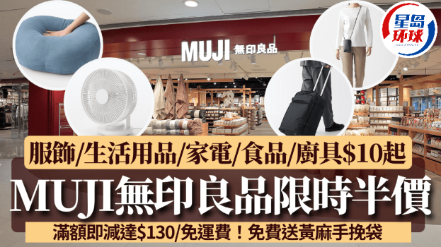 MUJI无印良品优惠限时5折!MUJI无印良品宣布3月举行周年祭,一连4日于官方网上商店推出多个优惠,各款人气货品低至半价起,当中涵盖服饰、生活用品、家电、食品、厨具等,最便宜$10即有交易,而且消费满额即可享多达$130折扣以及免运费优惠,更可免费获赠人气黄麻手挽袋,记得把握优惠扫货!