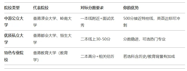 你的优势:500分远超录取门槛(通常350分+英语90分),可直接获奖学金(最高2万港币)。