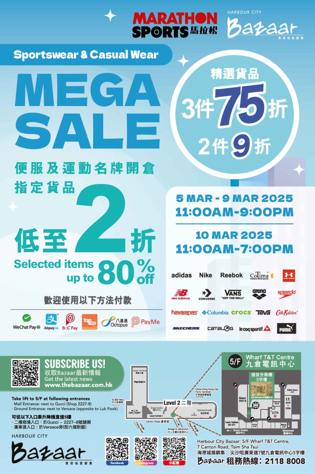 马拉松(Marathon Sports)及意大利休闲服饰品牌GEOX由即日起至3月10日,于尖沙咀海港城九仓电讯中心举行限定一连6日的展销会,有大量运动品牌特价货品发售,包括adidas、Nike、Reebok、New Balance、Converse、Columbia、VANS、crocs及puma等品牌的休闲服饰、便服、鞋款、袜及配件等,低至2折,部分更减至$20,非常抵买!加上有多买多减优惠,精选货品买2件额外有9折及买3件75折优惠。