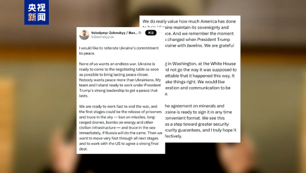 首页>国际>要闻 乌总统新闻秘书否认泽连斯基给特朗普写信 发布时间:2025-03-06 13:52 据乌克兰媒体报道,乌克兰总统新闻秘书尼基福罗夫当地时间3月5日表示,乌克兰总统泽连斯基并未致信美国总统特朗普,特朗普所说的“信”指的是泽连斯基在社交媒体上公开发布的帖文。乌克兰总统泽连斯基4日在社交媒体上发文说,他对日前与美国总统特朗普在白宫会晤时所发生的一切感到遗憾,乌方愿在任何时间签署美乌矿产协议,愿尽快开启谈判,以实现持久和平。4日,特朗普在对国会发表讲话时说,当天早些时候,收到乌克兰总统泽连斯基写给他的信函,乌方在信中表达了相同的意愿。来源:央视新闻客户端 热门文章 特朗普国会演说 | 万斯忘关麦克风对话疯传,疑似抱怨老板啰嗦惹热议 伦敦中国博士生迷奸10女罪成 ,临终身监禁 ,检方形容外表“聪明具魅力” 菲军方对仁爱礁坐滩军舰补给,中方:全程监管只能送生活物资 美国首与哈马斯直接谈判,特朗普发最后通牒:释放人质否则“你们死定了” 特朗普国会演说,宣布美国已回归 日本组合男神上村谦信,疑于砵兰街非礼香港女子,被即时退团解约 民进党内讧白热化,赖清德下封口令止血 96岁李嘉诚据报亲自处理长和天价交易,仅数周完成与美方谈判,成功把巴拿马港口转危为机 人妻带小王侵门踏户床战、车震,绿帽夫怒告求偿百万 马克龙:俄乌和平协议签署后,欧洲军队可能部署乌克兰 专题 更多 > 中芯国际上半年营收预计超22亿美元,四季度将试产7nm工艺 太兴盈喜料多赚逾3倍,指将坚守审慎理财政策 中国移动半年多赚5%,中期息增近6% 清华女学霸创业、一年一融资,镁佳股份估值9.3亿美元冲刺港交所 应收账款走高,丰沃股份三成收入打“白条” 惠科股份IPO:获政府补助超53亿,向实控人堂弟采购超8亿 关税战|白宫:特朗普签行政命令,对华关税暂缓期再延长90日 高盛:64%关税成本由美企“买单”,消费者仅承担22% 美媒:特朗普政府通过关税施压,要求买美国军火