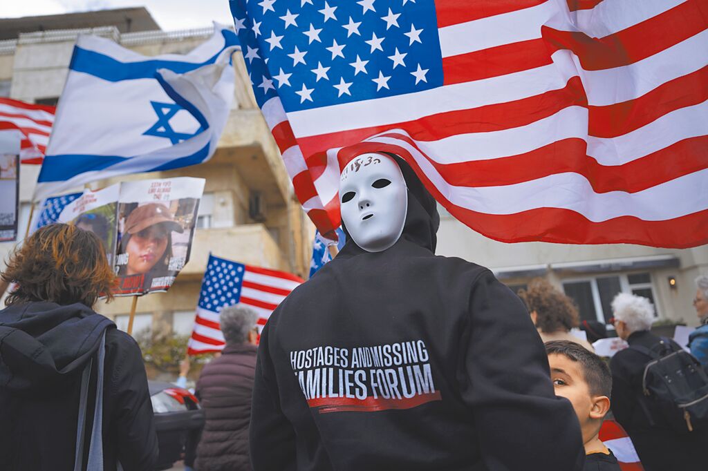▲2024年3月,人质家属挥舞着亲人的照片及以色列和美国国旗,要求返还人质。(美联社)