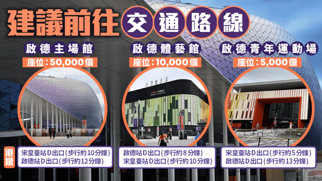 综合步行时间,若市民要到启德青年运动场,在宋皇台站D出口所需时间较启德站快约8分钟;而前往其余两个场馆的步行时间只相差约2分钟,有大型活动时可以选择经不同港铁站前往场地。