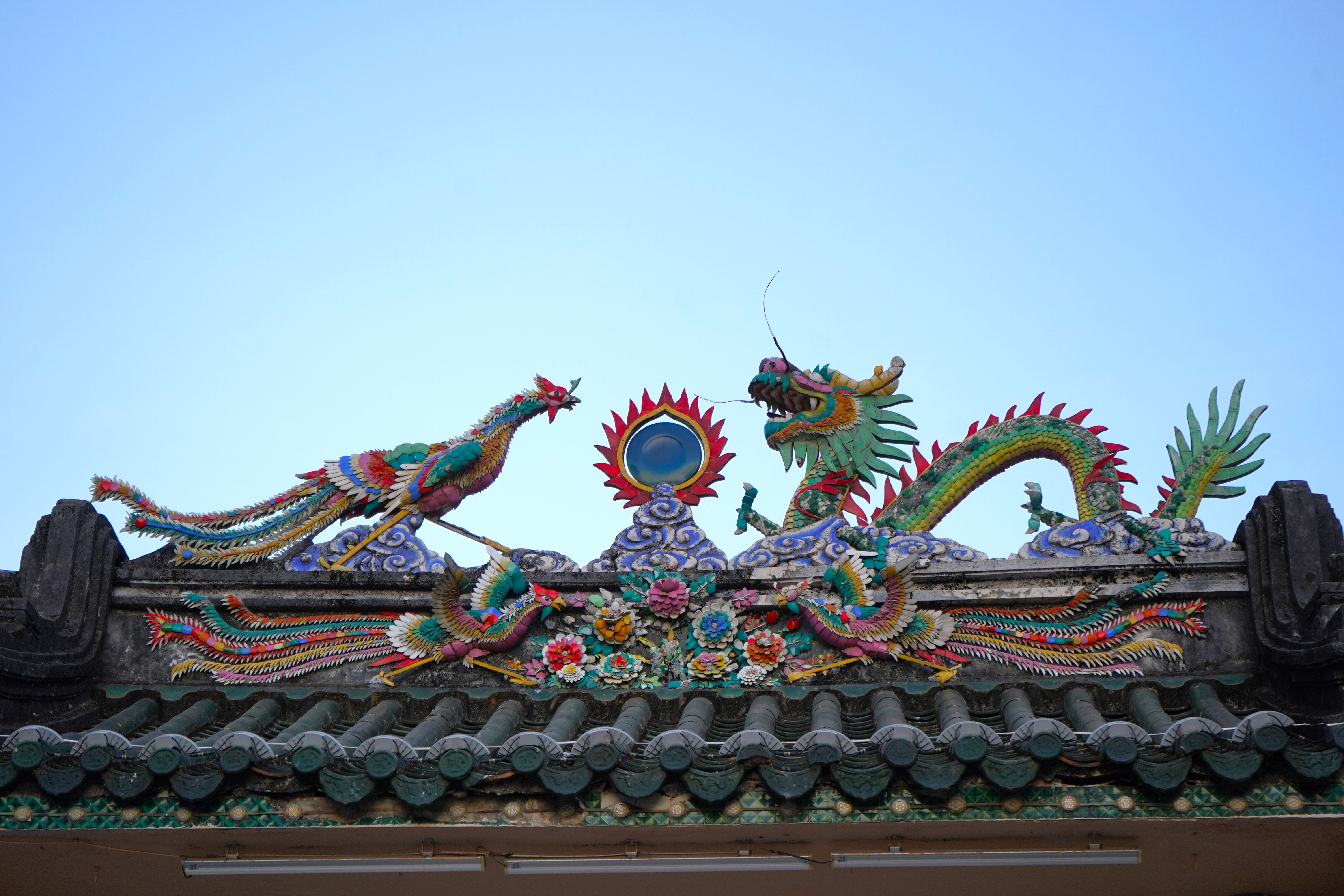 潮汕有句俗语,叫做“厝角头有戏出”,指的是潮汕人屋顶上的装饰,或龙飞凤舞、虎啸苍穹,或麒麟踏云、鱼跃龙门,宛若“一出大戏唱屋顶”,这些由色彩斑斓的瓷片拼接而成的工艺品,刻画着流传在坊间的戏剧故事和历史传说,成为一项特有的工艺美术。