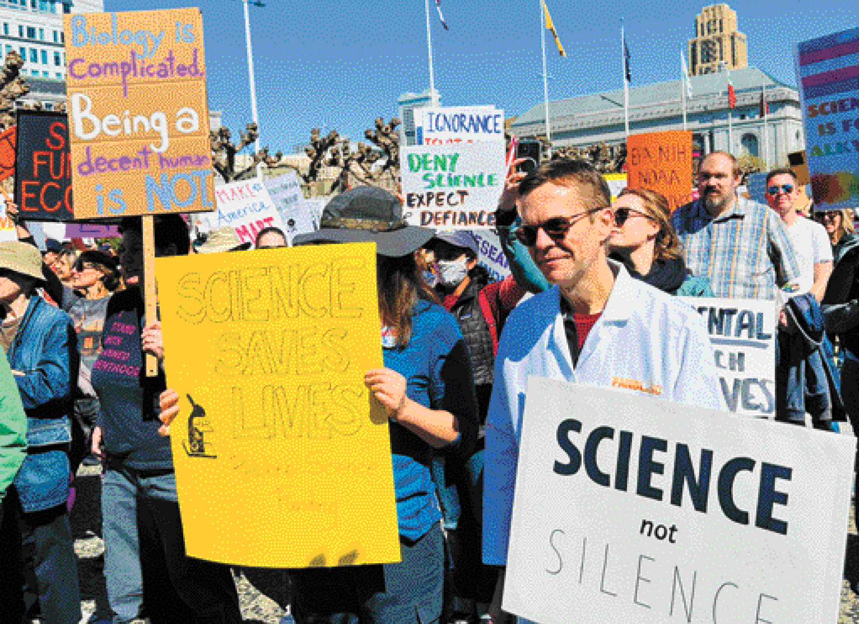 大批科学家和倡导者周五下午在旧金山市府广场集会,参与美国“为科学而战”(Stand Up For Science)活动。现场气氛热烈,群众高举标语“公共卫生优先于私人利益与“科学与正义,人人共享”,齐声高喊:“这就是民主的模样”。