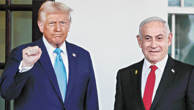 ▲特朗普2月4日在白宫入口处迎接到访的以色列总理内塔尼亚胡。路透社资料图片
